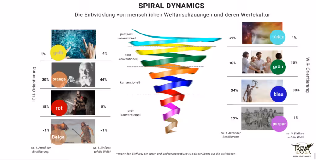 Wenn wir gesellschaftlichen Kulturwandel fordern, sollten wir uns auch bewusst machen, dass nach wie vor ca. 2/3 der Menschen in konventionellen Umständen leben (blau und orange). Erst ca. 11% der Menschen leben in postkonventionellen Umständen.